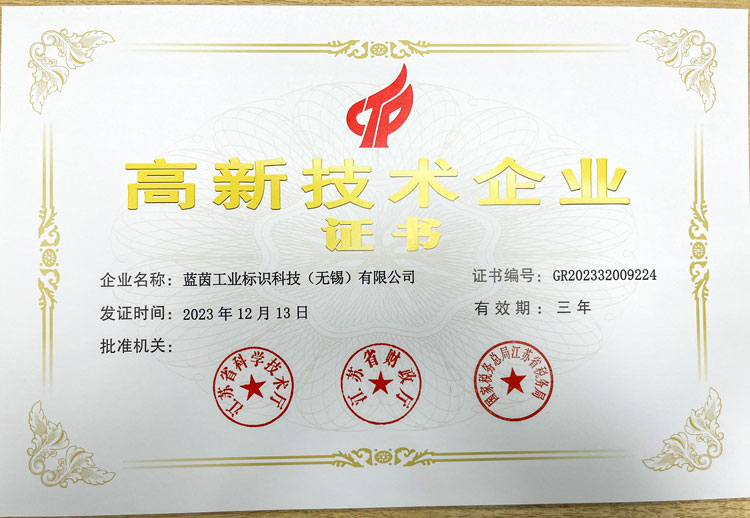 近日,藍茵工業標識科技(無錫)有限公司喜獲國家級“高新技術企業證書”,成為國家高新技術企業,并頒發了證書。此次藍茵LIONTEC取得的《高新技術企業證書》,發證審批機關分別為江蘇省科學技術廳、江蘇省財政廳、國家稅務總局江蘇省稅務局。證書的頒發充分說明了國家相關部門對藍茵