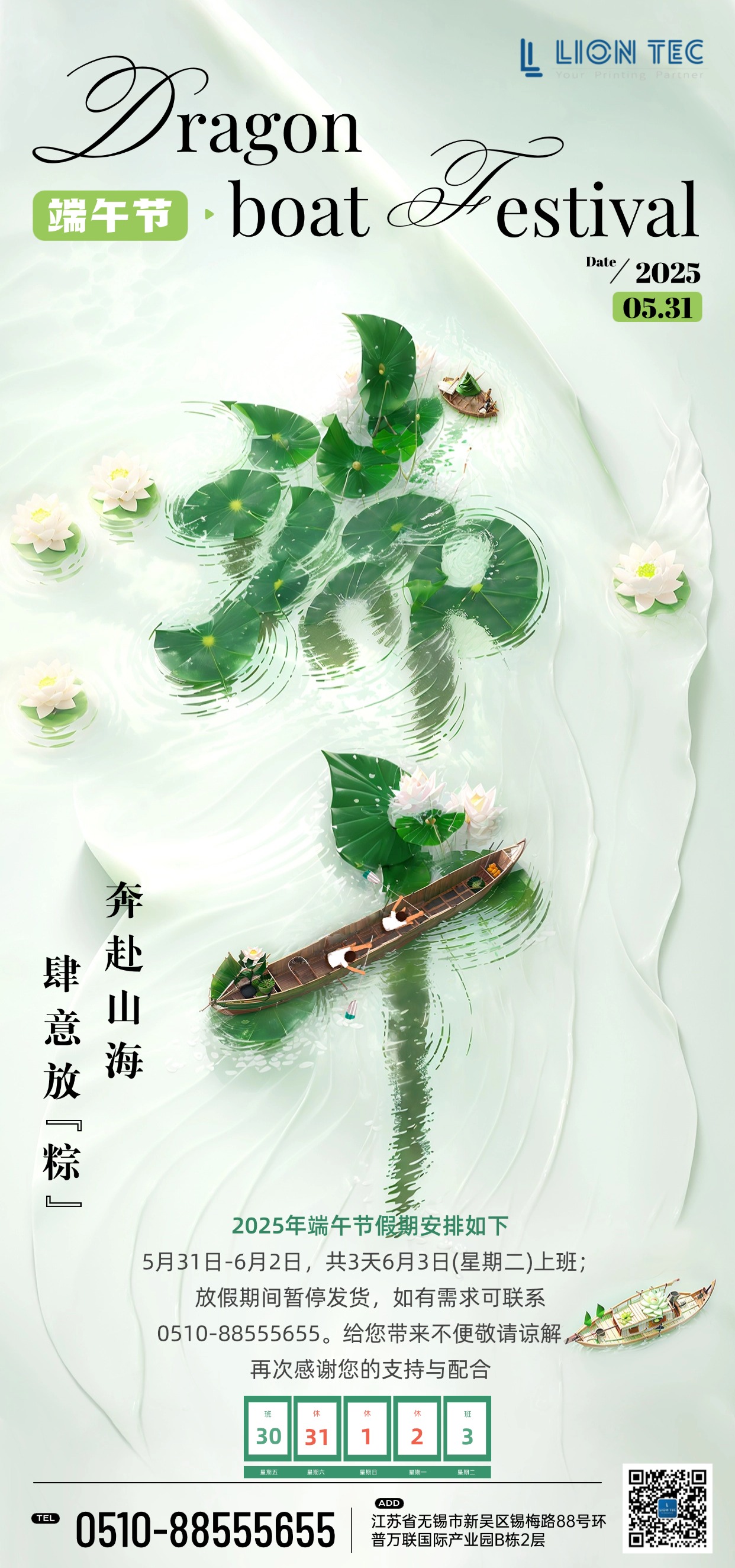 花開半夏,雨落成詩,端午已至,祝君安康!五月初五端午節即將到來,根據國家法定節假日固定,噴碼機廠家-藍茵現將2025年端午節放假安排通知如下: